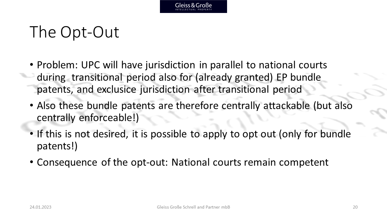 Gladly, we will provide you with our latest information sheet regarding the options to opt-out of the new unitary patent system. And of course we will be happy to advise you regarding the new system and to keep you informed.